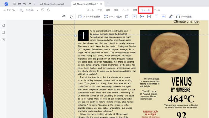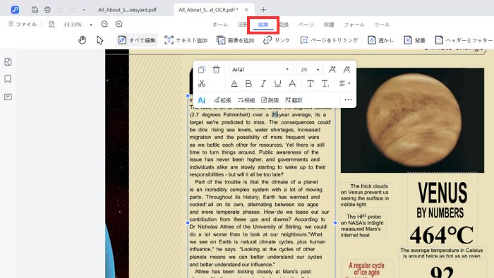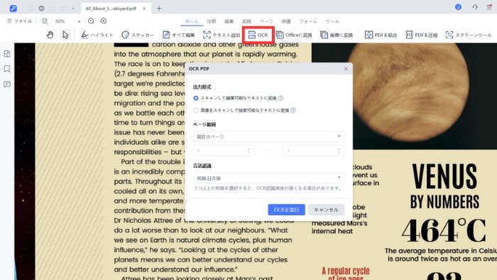 OCRとは、画像として保存されている文字を、編集可能なテキストデータに変換する機能です。OCRを実行することで、PDFの内容を編集できるようになります。