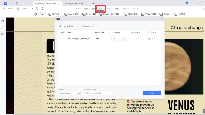 出力するファイル形式は、Word・Excel・Powerpoint・JPEG・PNG・BMP・TIFF・TXT・RTF・EPUB・PDF/Aに変換できます。