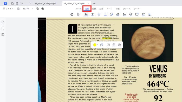 文章を強調したい場合は、ハイライト・下線・取り消し線などをワンクリックで追加可能。コメントの挿入にも対応しており、特定の箇所にメモや説明を残せます。