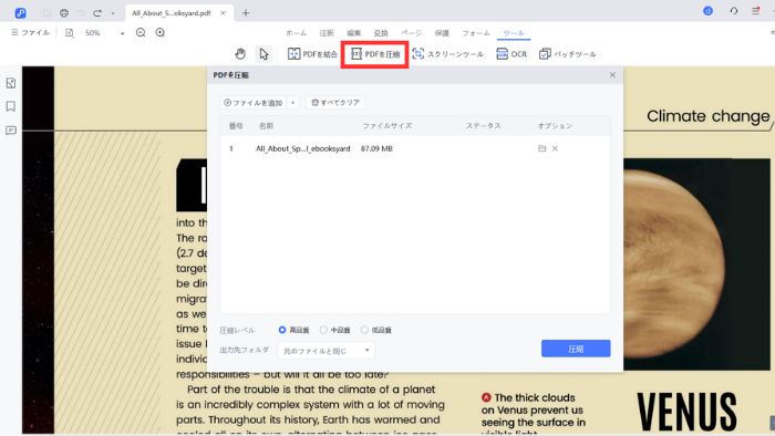 圧縮機能を使うと、容量が大きなファイルを、テキストや画像の鮮明さを保ちながらサイズを削減できます。
