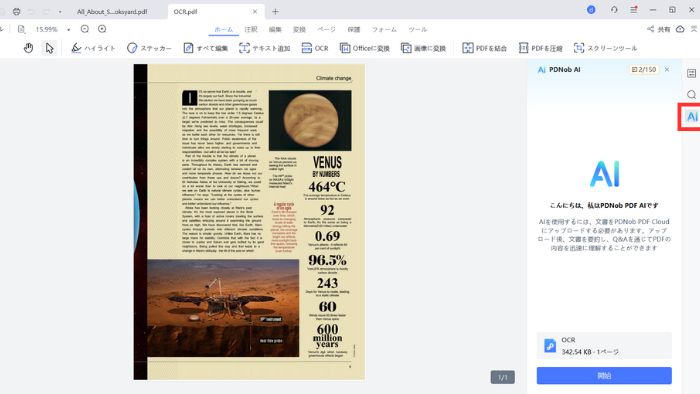 「PDNob」の大きな特徴が、AIを活用したサポート機能です。PDF内の文章を自動で解析し、要約・翻訳・文章生成などを行えます。
